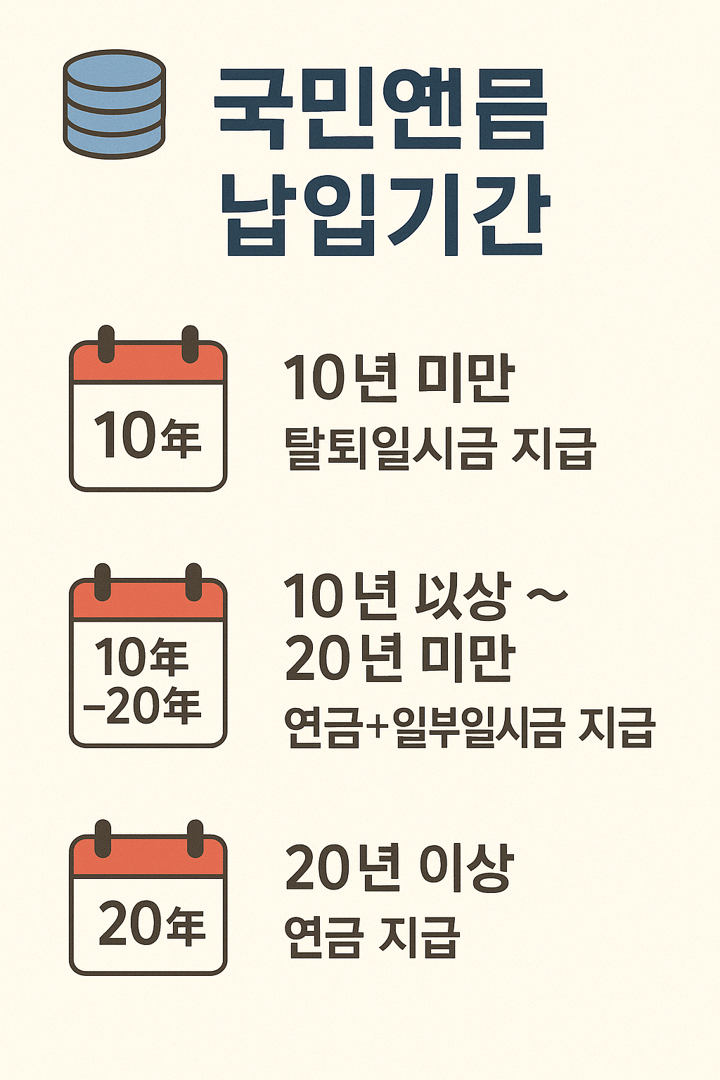 10년 미만이면 연금이 안 나오고, '반환일시금'만 받을 수 있어요. 수급권 확보를 위해 10년은 반드시 채워야 해요. - 수령액 결정