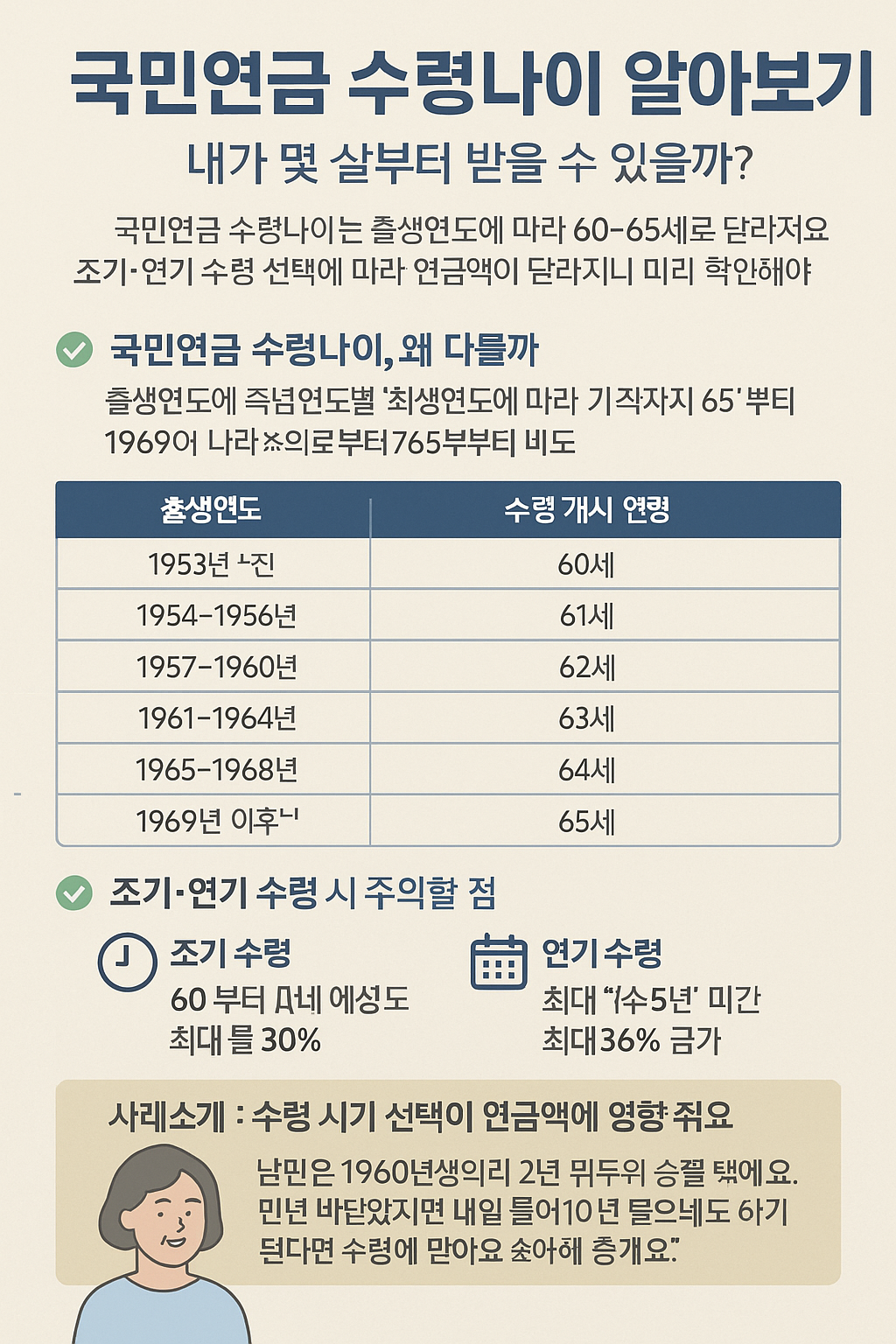 ‘출생연도별 국민연금 수령 나이 + 조기·연기 수령 정리표’ 인포그래픽 제작 가능