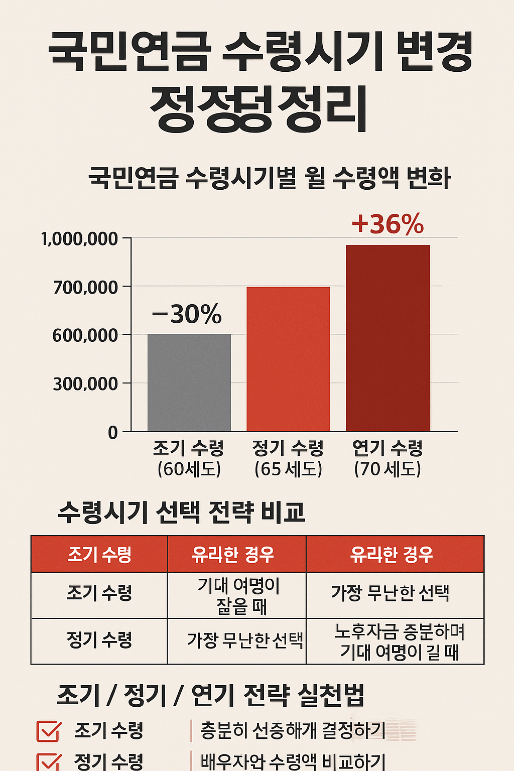 인포그래픽 제안 문장: 국민연금 수령시기별 월 수령액 변화 그래프 + 조기/정기/연기 전략 비교 차트로 시각화