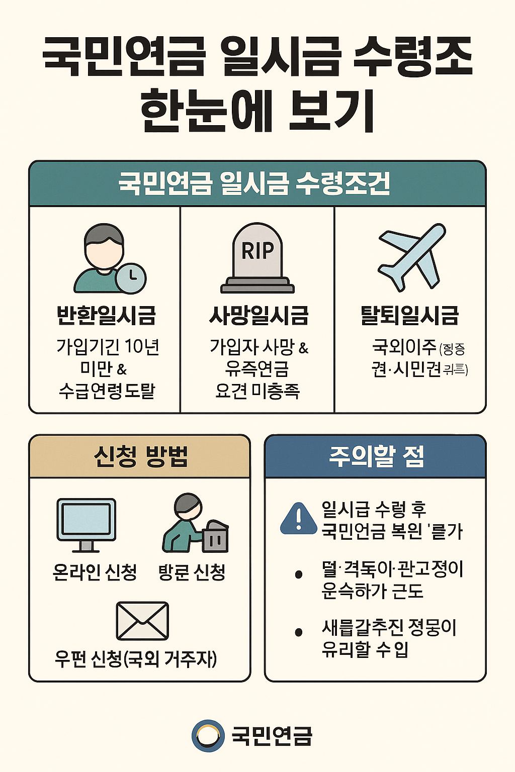 국민연금 일시금 수령조건은 10년 미만 가입자, 국외 이주자, 가입자 사망 시 유족 등에게 해당.