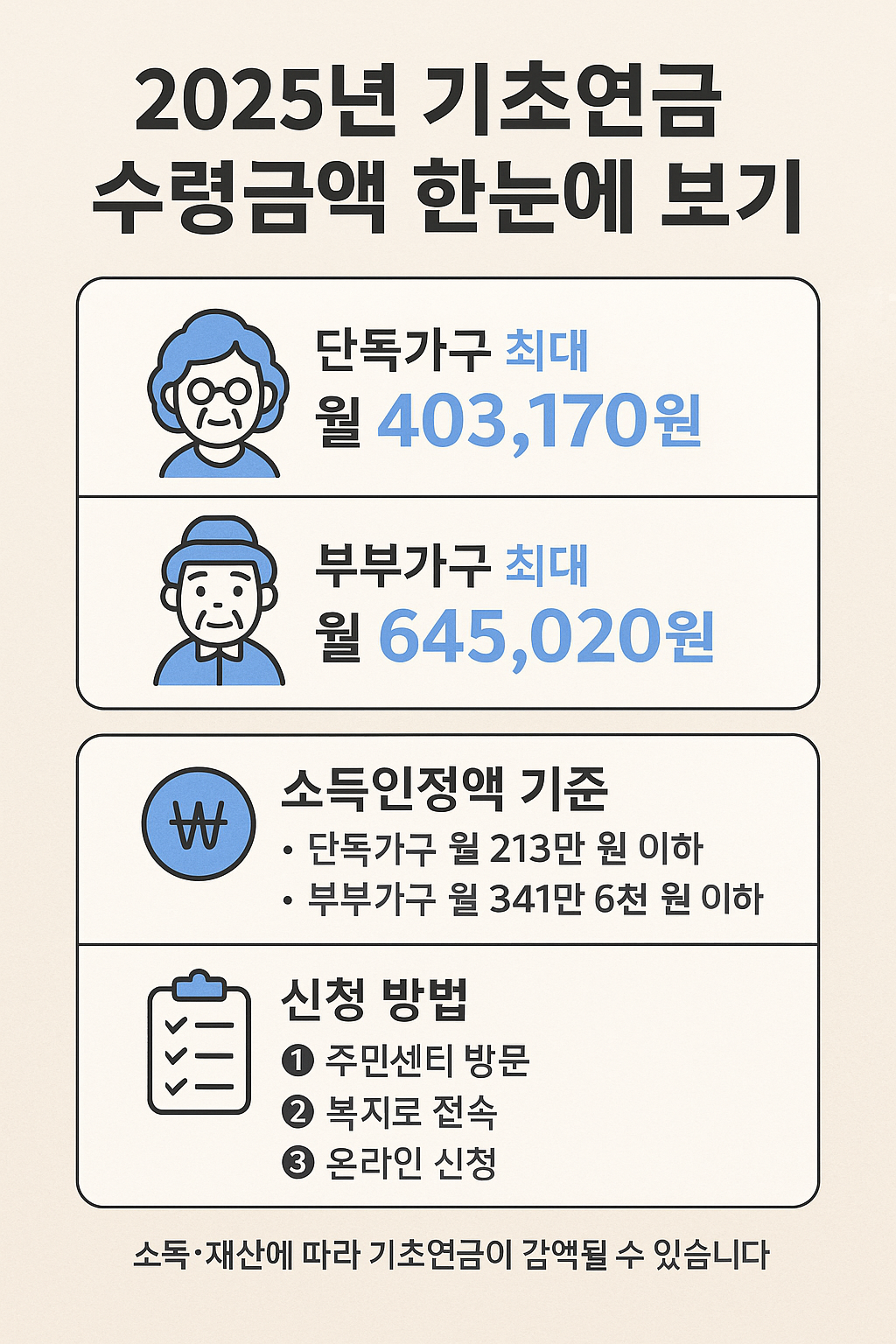 기초연금 수령금액 2025년 기준 단독가구 최대 40만3,170원, 부부가구 최대 64만5,020원까지 받을 수 있습니다.
