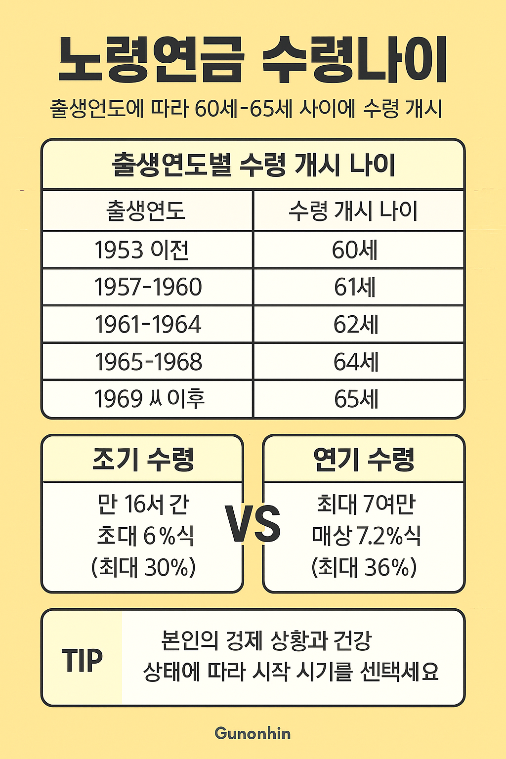 출생연도별 수령 개시 연령 요약 + 조기/연기 수령 비교 인포그래픽 제안