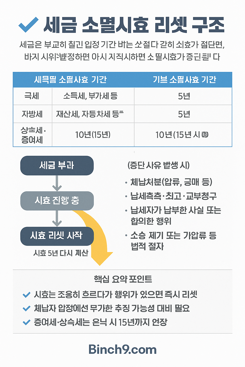 인포그래픽 제안 : ‘세금 소멸시효 리셋 구조’ – 세목별 기간 + 중단 사유 도식화