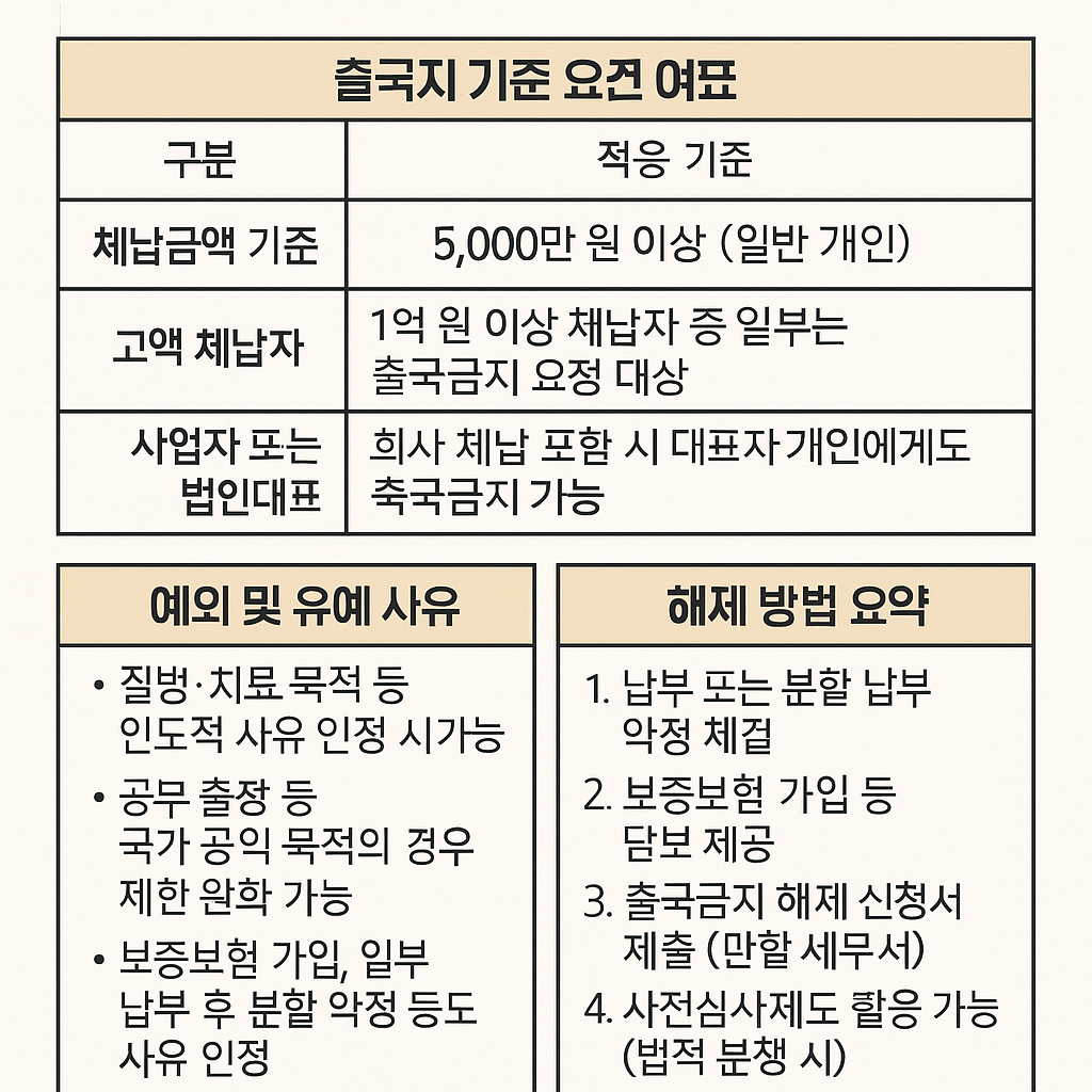 인포그래픽 제안 : ‘출국금지 대상 요건 요약표’ – 체납 금액 기준 + 예외 + 해제 방법 정리