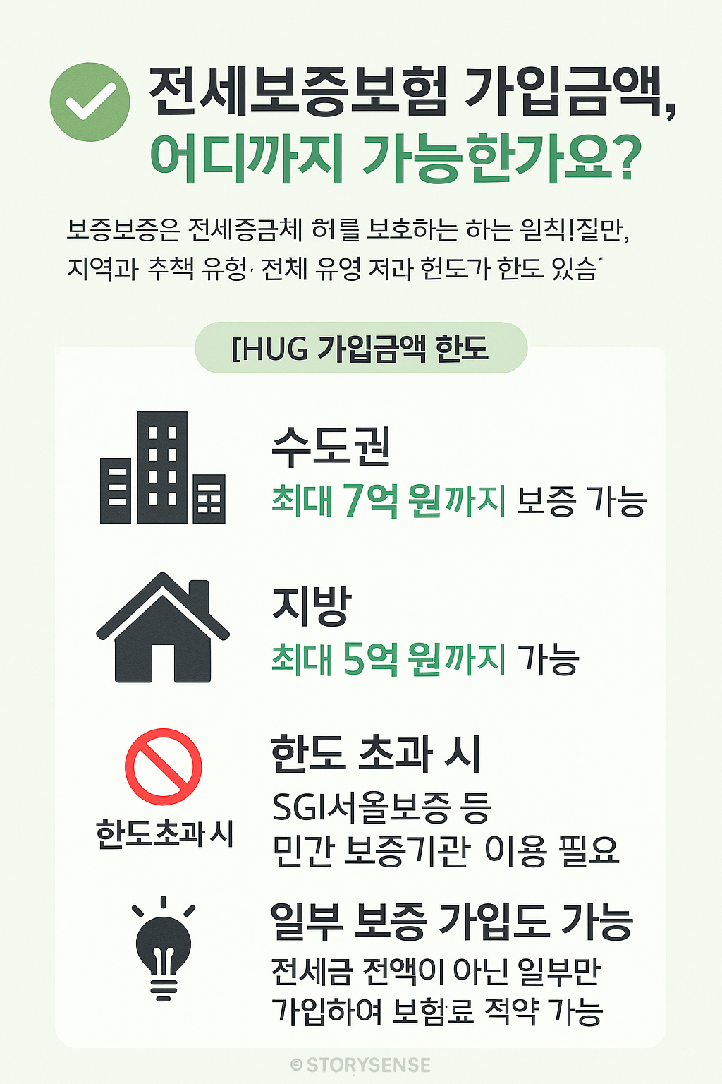 HUG는 수도권 7억, 지방 5억 초과 시 제한이 있습니다. 초과분은 SGI서울보증 등 타 기관을 통해 별도 가입이 가능합니다. 일부 보증만 HUG에 가입하는 방식도 가능합니다.