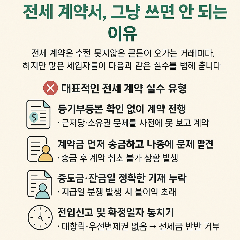 이러한 실수들은 전세금 반환 거부, 이중 계약, 집주인 근저당 설정 등의 심각한 문제로 이어질 수 있습니다.