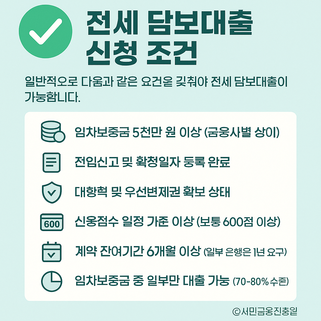 일반적으로 다음과 같은 요건을 갖춰야 전세 담보대출이 가능합니다.