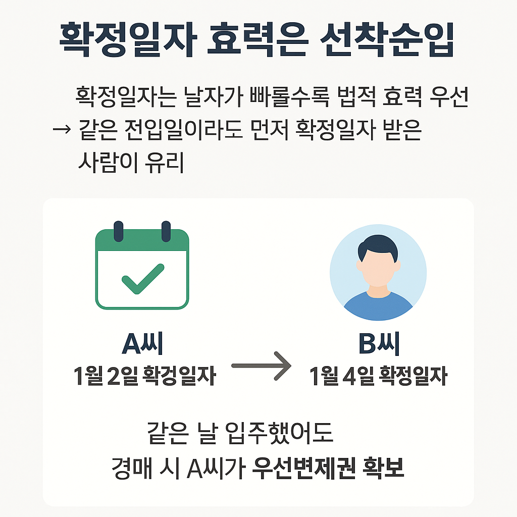 예를 들어, 같은 날 입주했어도 A씨가 1월 2일 확정일자, B씨가 1월 4일 확정일자를 받았다면, 경매 시 A씨가 우선입니다.