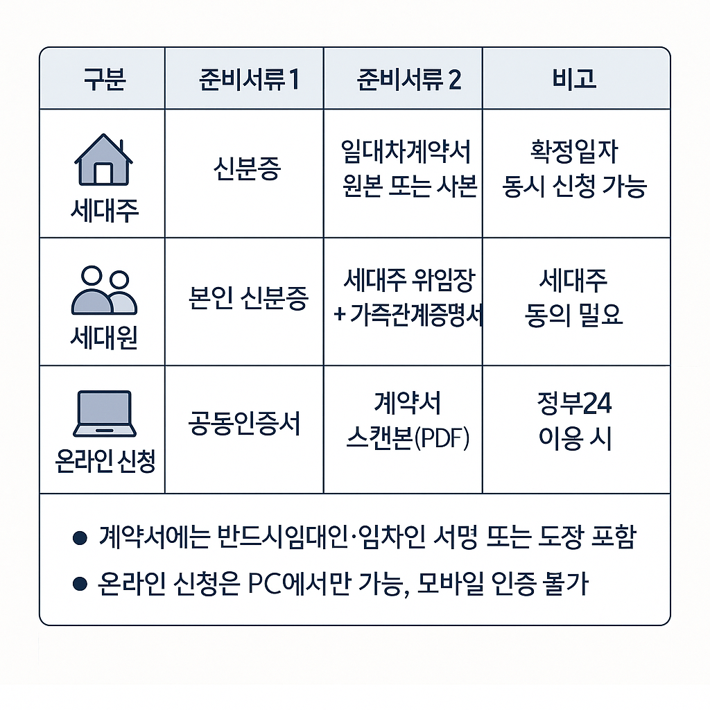 | 세대원(배우자, 자녀 등) | 신분증, 세대주의 동의서 또는 위임장 | 위임장에는 세대주 도장 필수 |