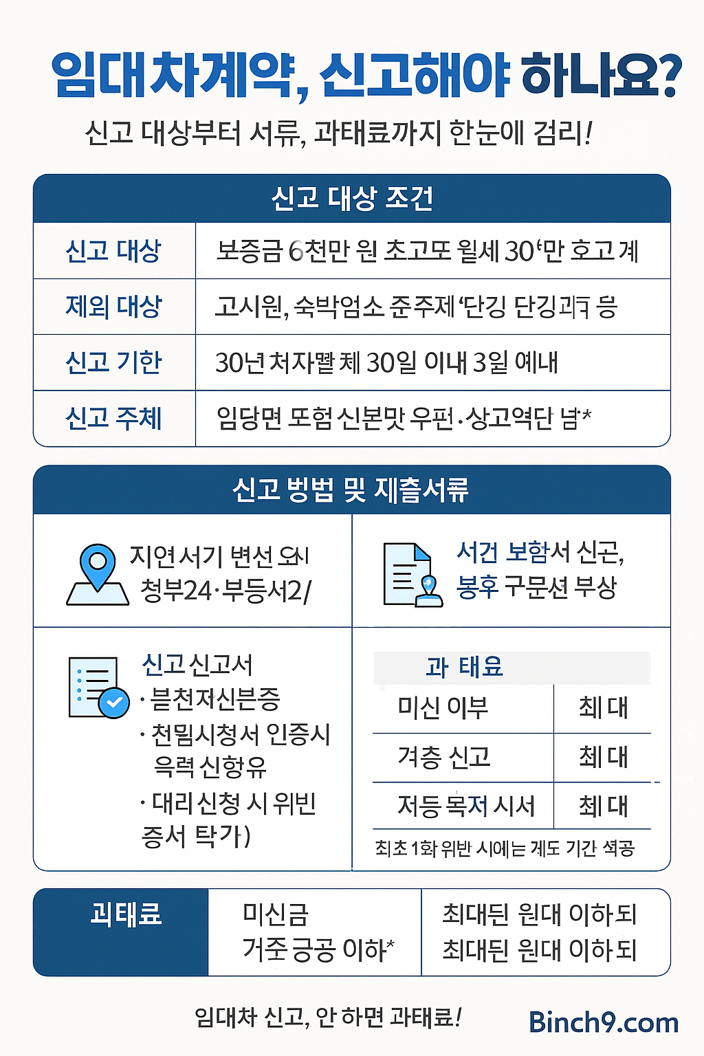 인포그래픽 제안 : ‘임대차계약 신고 절차 한눈에 보기’ – 대상 조건 / 신고 방법 / 제출서류 / 과태료 요약표