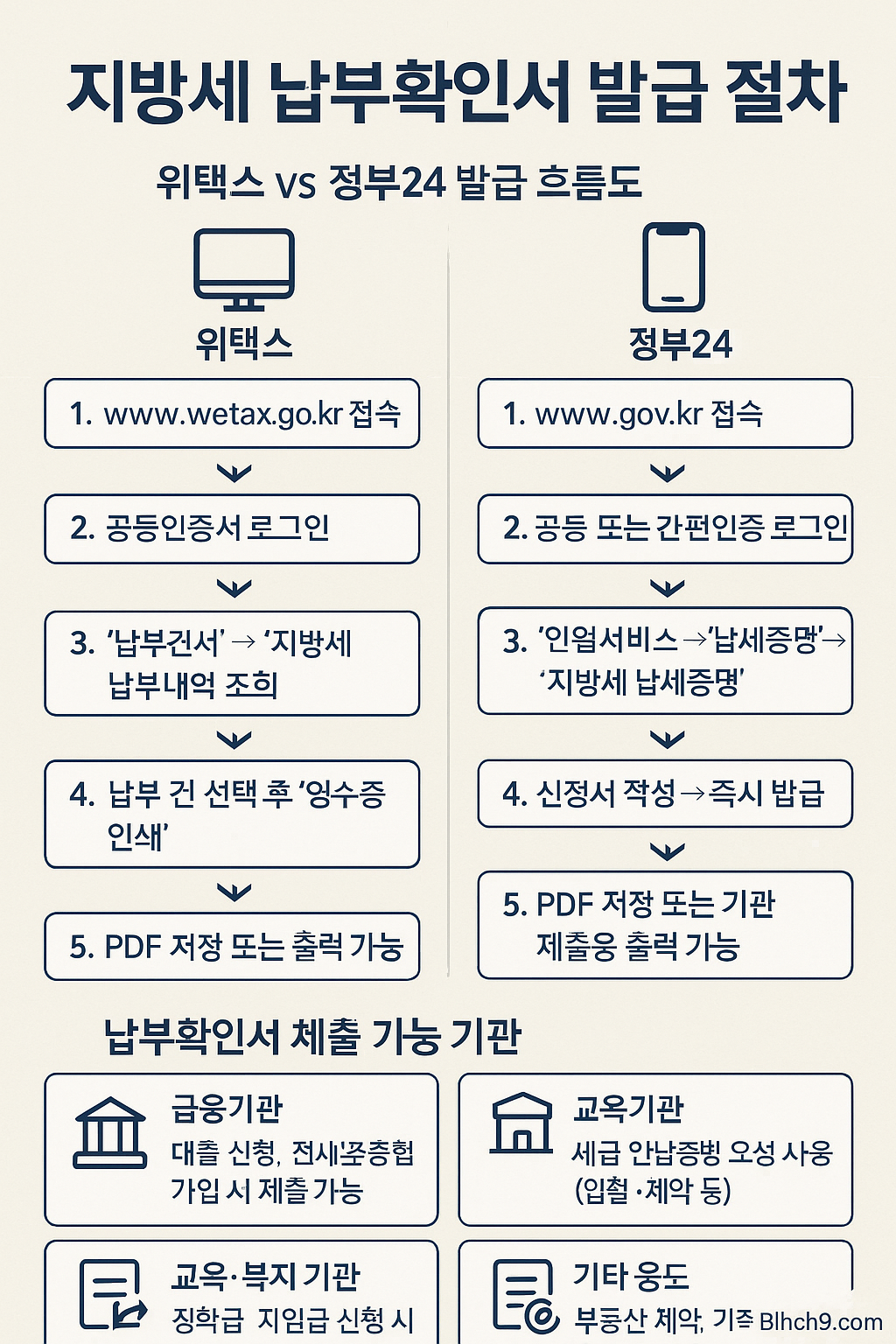 인포그래픽 제안 : ‘지방세 납부확인서 발급 절차’ – 위택스 vs 정부24 비교 흐름도 + 제출 가능 기관 요약