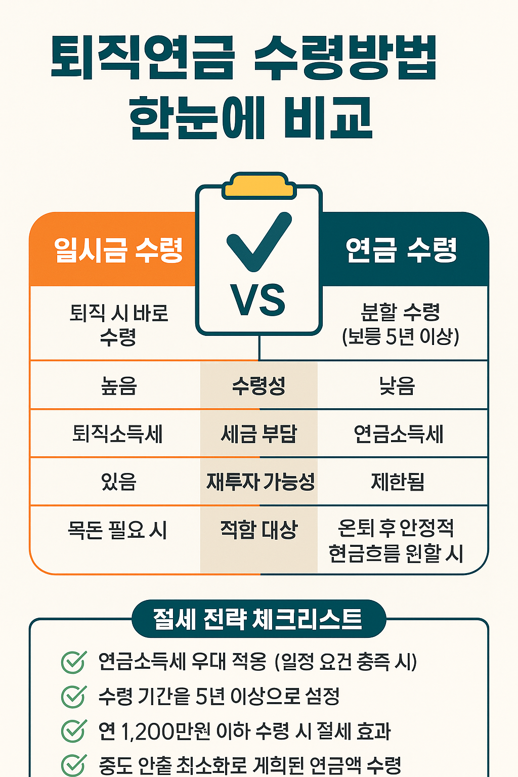 인포그래픽 제안: "퇴직연금 수령방법 한눈에 비교" (일시금 vs 연금 수령 비교표 + 절세 전략 체크리스트)