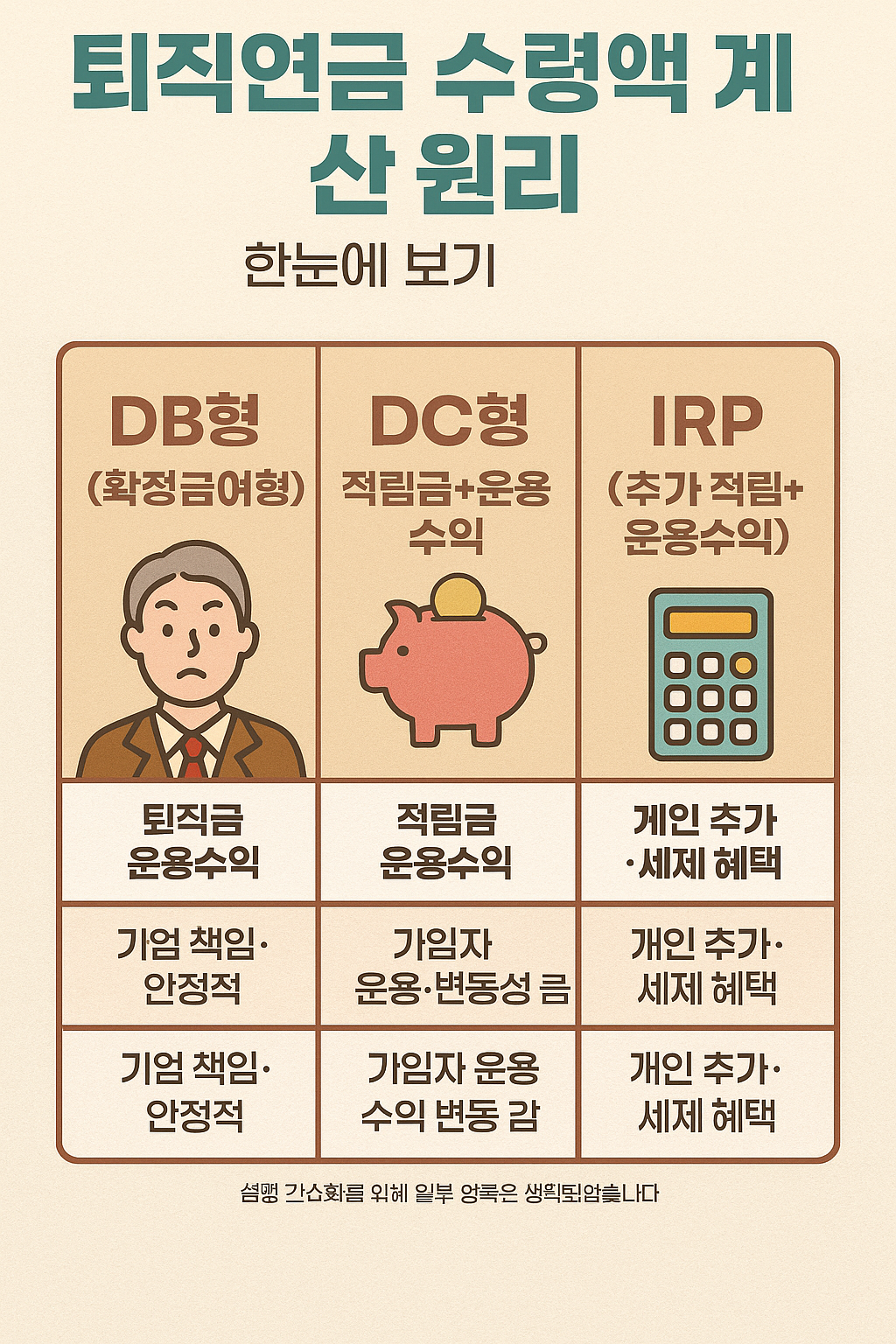 퇴직연금 수령액은 유형(DB형/ DC형/ IRP)에 따라 계산 방식이 다릅니다.