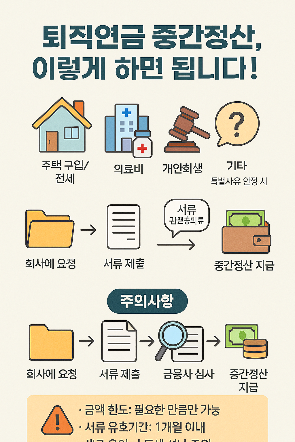 중간정산은 쉽게 받을 수 있는 게 아니라 요건과 서류를 엄격히 검토해요. 특히 아래 3가지를 주의하세요.