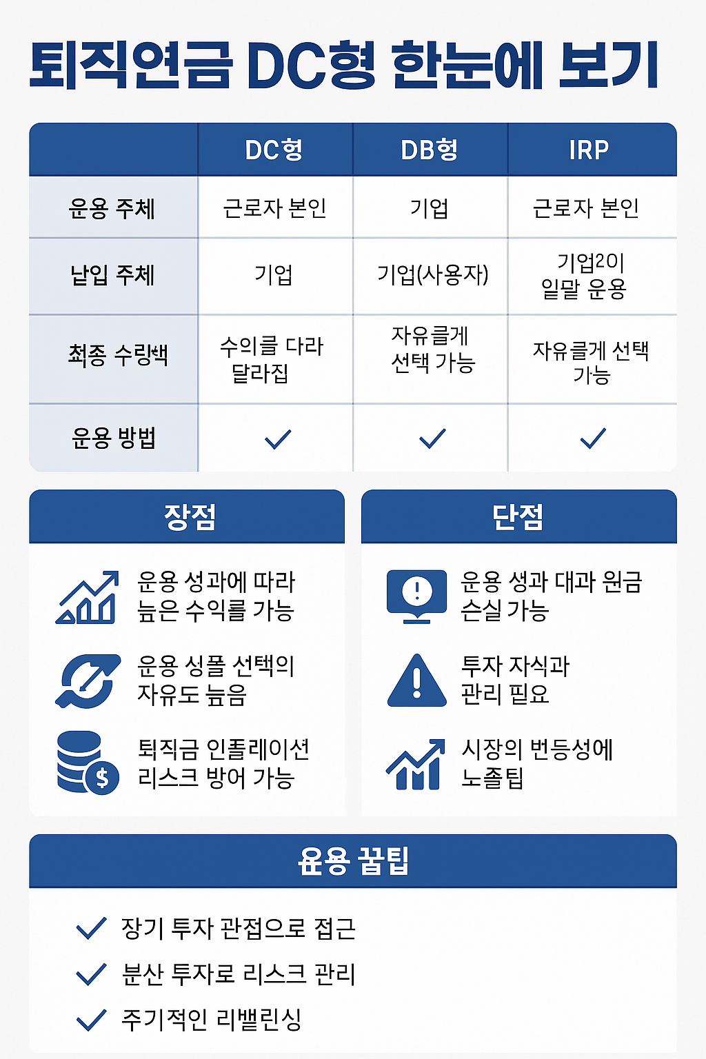 오늘은 DC형 퇴직연금이 무엇인지, 장단점, 운용 방법, 수익률, IRP와의 차이까지 꼼꼼히 정리해드릴게요!