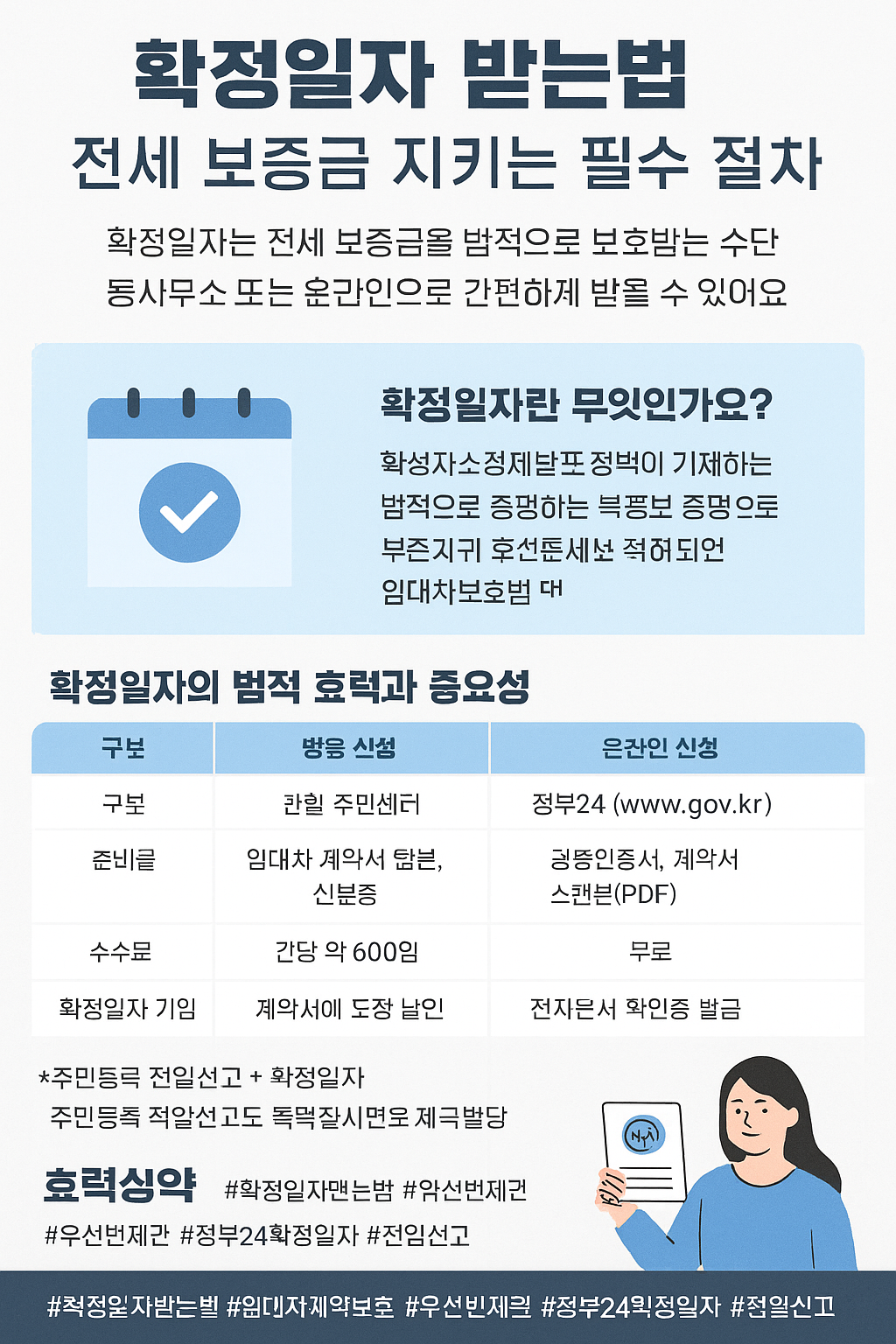 확정일자는 임대차계약서를 공적으로 인정받는 날인으로, 보증금 보호의 핵심 장치예요. 주민센터 또는 정부24를 통해 쉽게 신청 가능하며, 전입신고와 함께하면 효과가 커집니다.