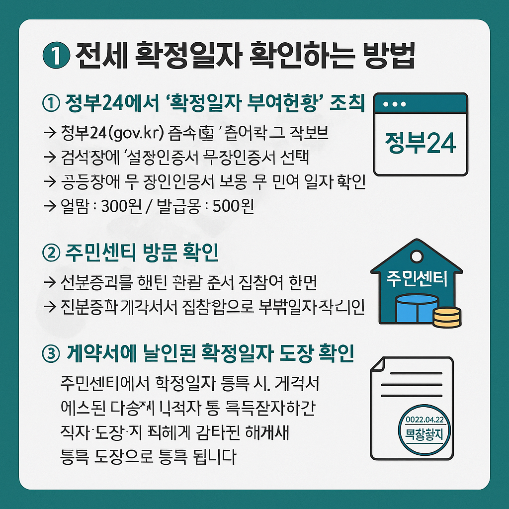 | ① 온라인 조회 | 정부24에서 '확정일자 부여현황' 조회 | 공동인증서, 주소 정보 | 열람 300원 / 발급 500원 | 보증보험, 법원 제출 등 공적 용도 가능 | 비대면 가능, 빠른 확인 | 정확한 동·호수 입력 필수 |